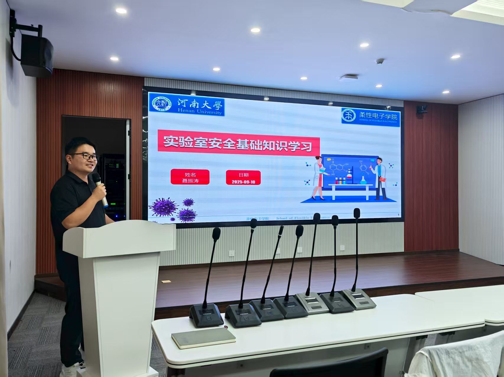 活动最后,聂振涛老师结合校园安全事故和火灾案例警示片,从实验室常见危险源,不安全行为,实验室操作规范,以及火灾发生时的应急预案,普及实验室安全知识与防护技能,划定了实验室安全红线,为同学们筑牢了实验室安全的思想防线