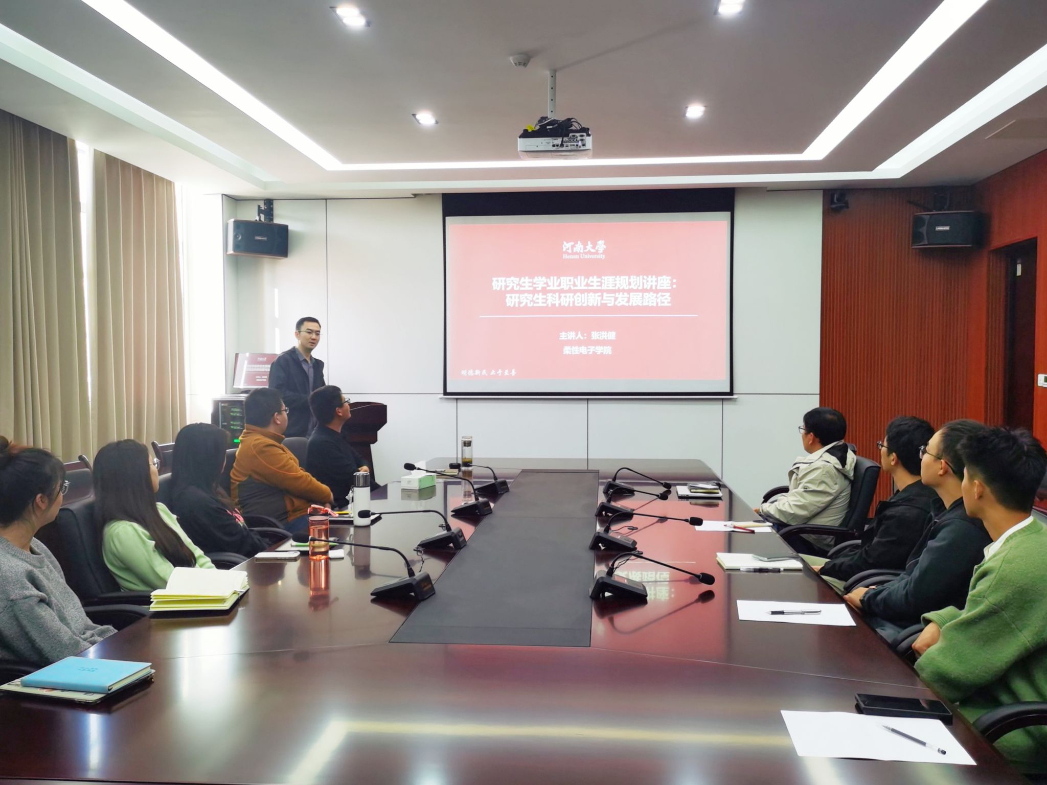 国家自然科学基金基金获得者、院长助理张洪健就研究生学业职业生涯规划为主题展开了精彩的报告。报告围绕身份定位、求学之路、科研目标、职业规划等方面进行讨论,鼓励新生们珍惜大学时光,培养能力,保持好奇心,勇敢地去去挑战,为自己的人生打下坚实的基础,启发同学们对进一步明确研究生阶段的个人理想和奋斗目标进行深入思考