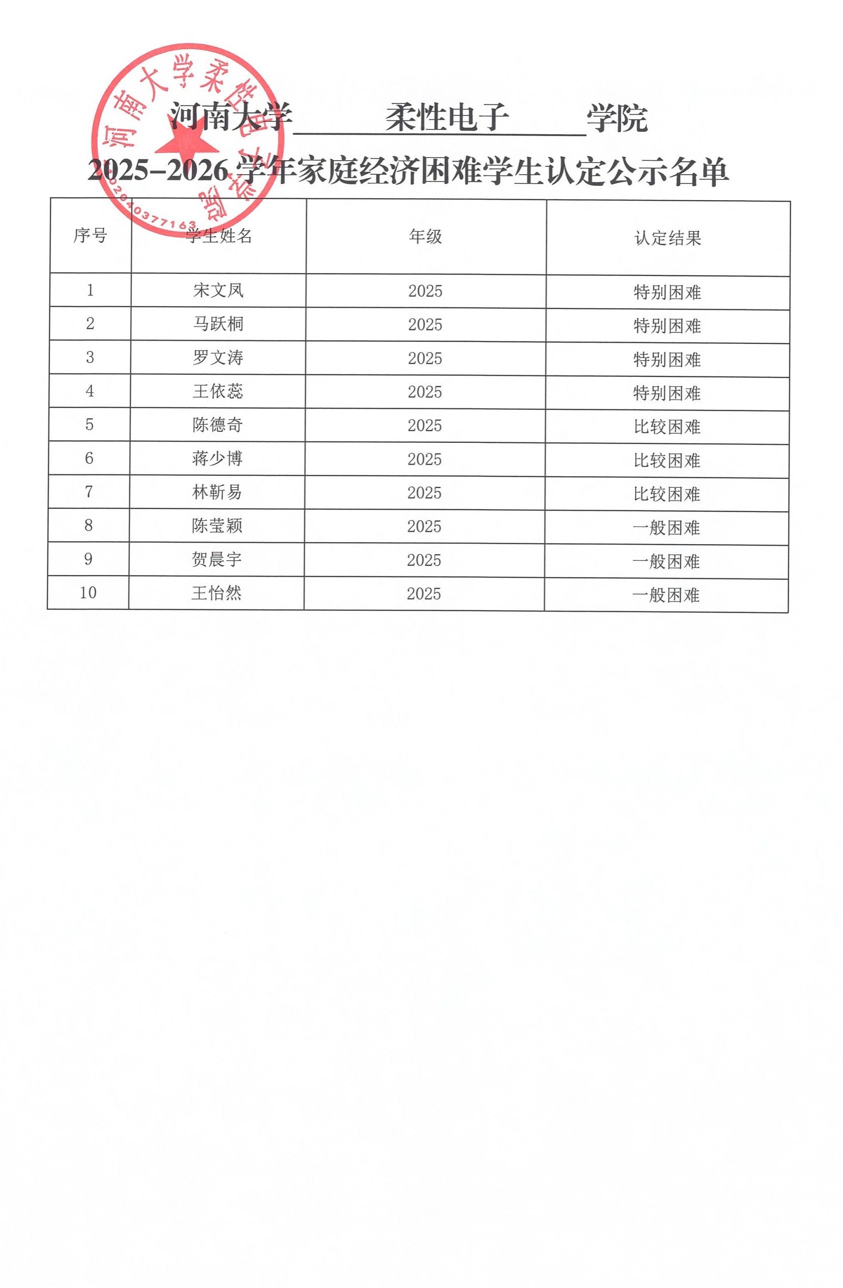 麻豆网 家庭经济困难学生认定结果公示