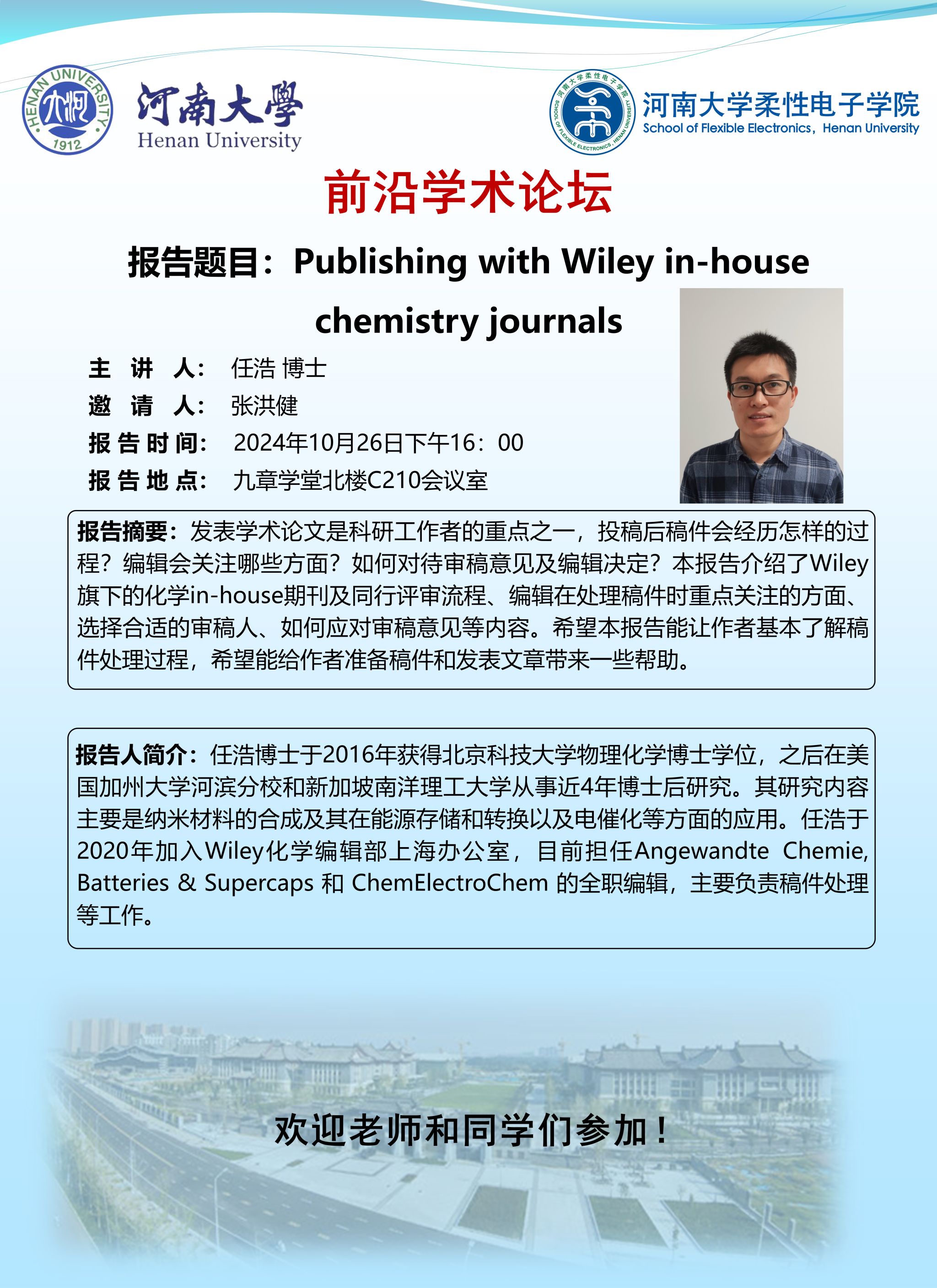 [前沿学术论坛] 第2期 Wiley化学编辑部任浩博士学术报告